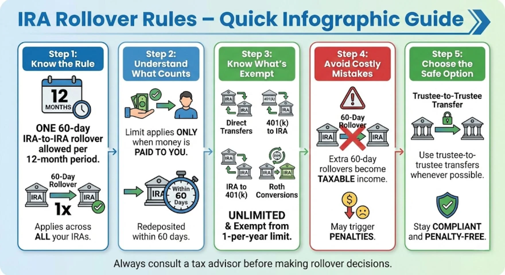 Because of these distinctions, most people should rely on direct transfers rather than 60-day rollovers whenever possible. Understanding how the rule truly works allows you to move retirement assets confidently, preserve tax advantages, and avoid unnecessary penalties while maintaining full control over your long-term financial strategy.